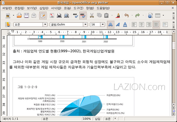 그리고 특히 워드 프로세서에서 잘 나타나는 현상인데, 기존 마이크로소프트 문서를 읽어들여서 글꼴을 바꾸면 줄 간격이 굉장히 넓어지게 되곤 합니다. 처음부터 오픈 오피스로 작업한 문서는 이런 현상이 없는데 이 역시 글꼴에서 생기는 문제가 아닐까 합니다.