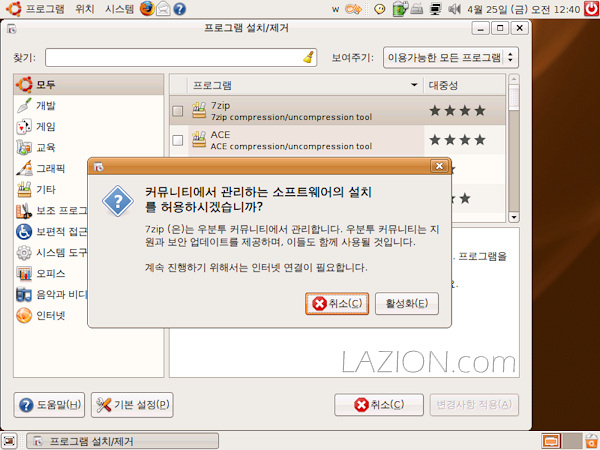 프로그램 설치/제거에 들어가면 우분투 커뮤니티에서 관리하는 다양한 소프트웨어의 목록을 하나하나 살펴보고 골라서 설치/제거할 수 있습니다. 화면에 나온 것은 예전에 소개해 드린 적이 있는 7zip의 우분투 버전입니다.